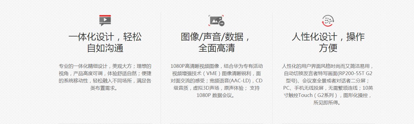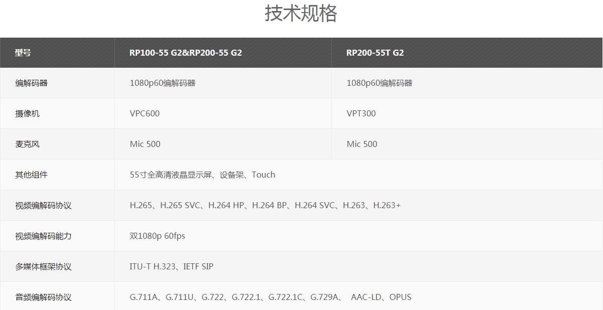 HUAWEI RP G2 系列一体化智真集编解码器、摄像机、显示器等设备于一体,部署简易快捷,可快速将普通会议室转化为智真会议室,带来高清流畅的视频会议体验。