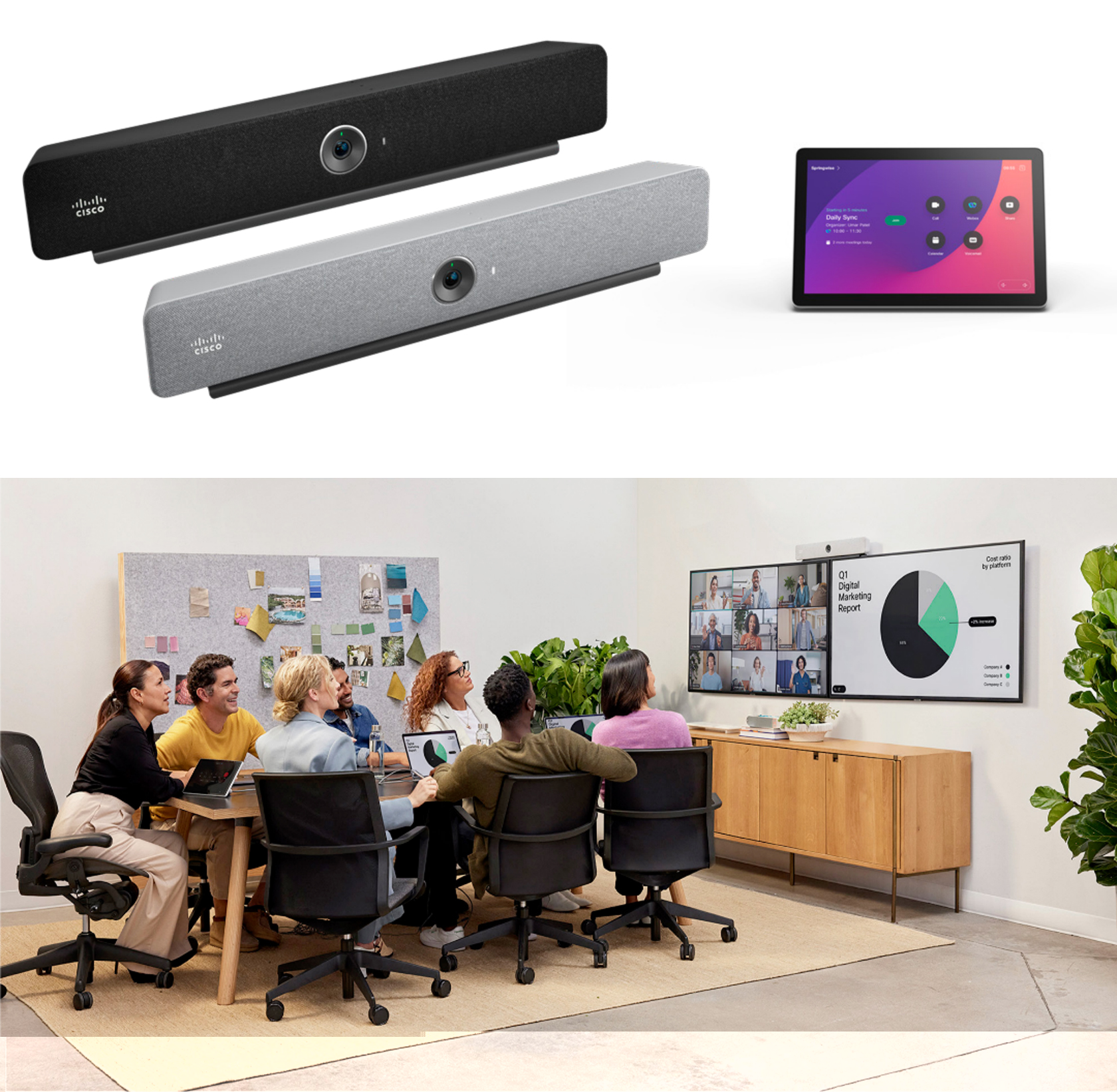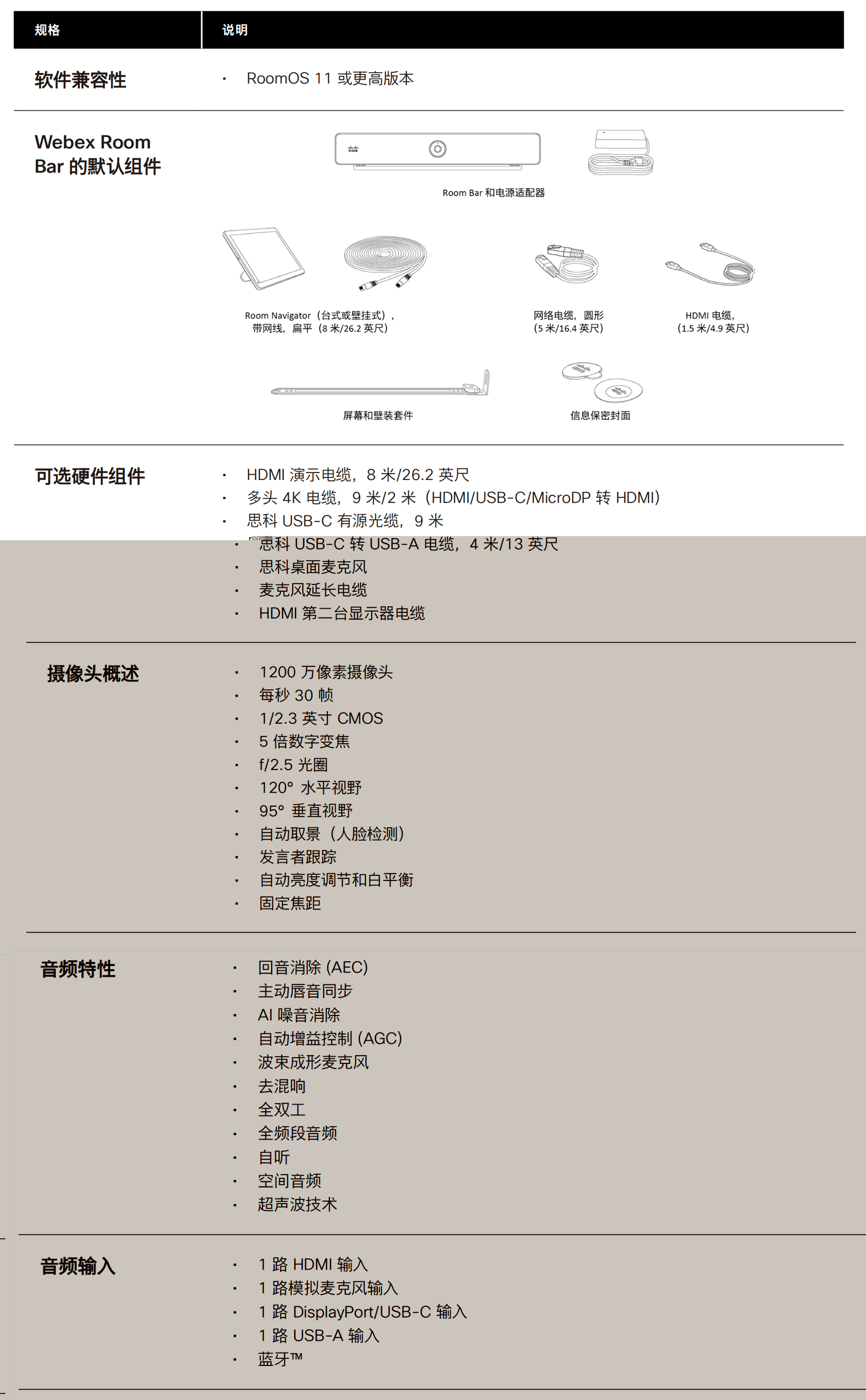 思科Room Bar是现代办公的紧凑型视频协作设备,为中小型会议室、专注室等提供一体化智能视频会议体验。是一款易于使用、功能丰富且高度灵活的设备,提供沉浸式会议和协作体验,以及统一设备管理、简化的部署和顺畅无阻的采用。集高清视频、沉浸式音频、智能会议控制于一体,支持Webex等多平台。有高清摄像头与消噪麦克风,音视频沉浸感佳;可跨平台入会;借AI优化摄录和音频;支持云端、本地、混合部署,满足企业多元需求。